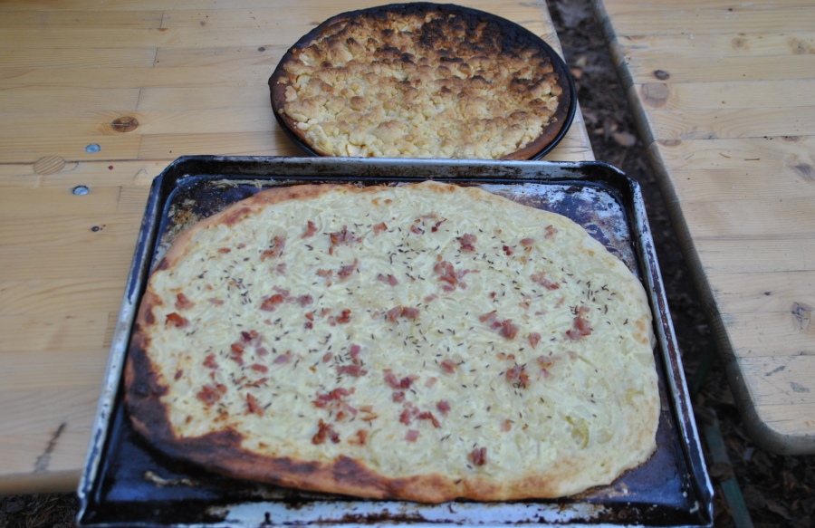 Heute backen wir gemeinsam im Holzbackofen. Zu Beginn bis etwa 15.30 Uhr ist die Temperatur geeignet für Flammkuchen. Anschließend kann man Pizza bis circa 16.30 Uhr, danach Brot, Brötchen oder Kuchen backen - zum Mitnehmen oder zum direkten Verzehr.